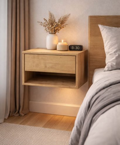 Mesa de Luz Flotante Low Cost Nordica 40 cm con Cajon con Guias Metálicas Encerado y Lustrado